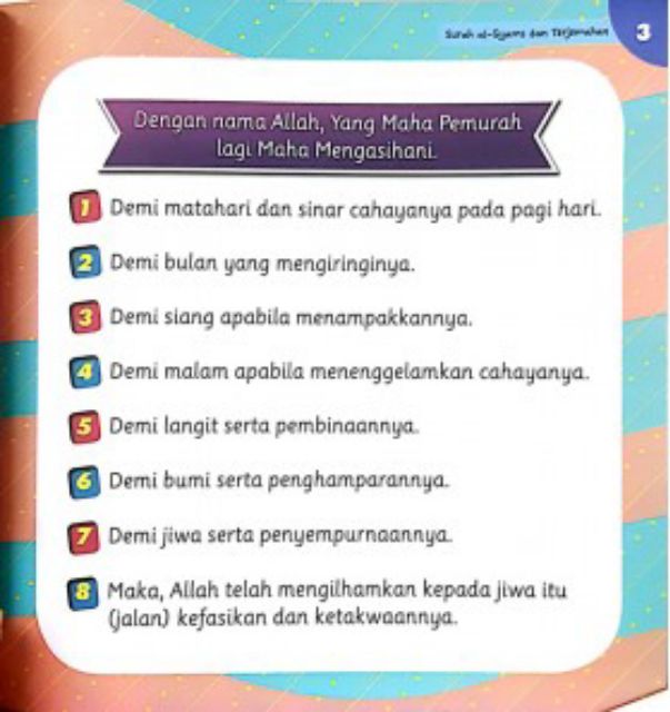 Dan sungguh rugi orang yang mengotorinya 9. بسم ٱلله ٱلرحمن ٱلرحيم وٱلشمس وضحىها. Asy-Syams Matahari 15 ayat.